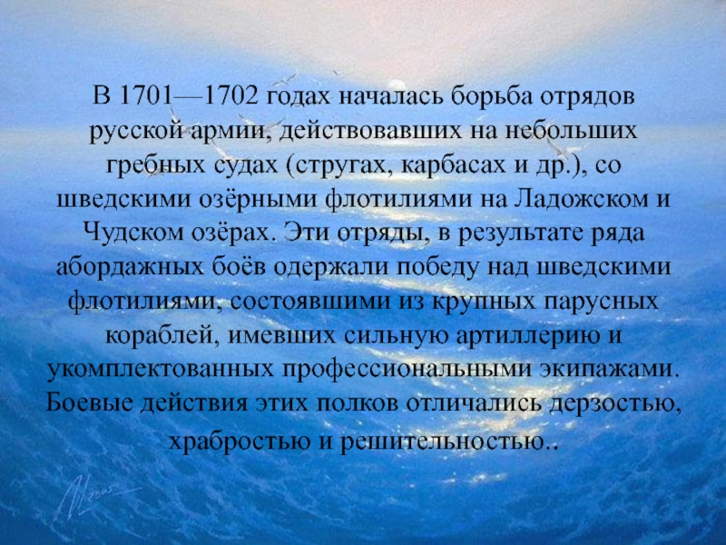 гребных судах (стругах, карбасах и др.), со шведскими озёрными флотилиями на Ладожском и Чудском озёрах. Эти отряды, в результате ряда абордажных боёв одержали победу над шведскими флотилиями, состоявшими из крупных парусных кораблей, имевших сильную артиллерию и укомплектованных профессиональными экипажами. Боевые действия этих полков отличались дерзостью, храбростью и решительностью..