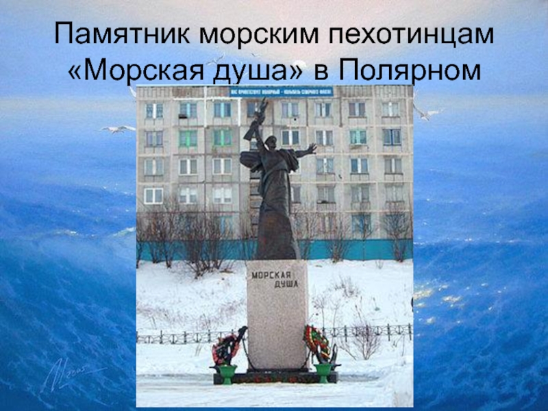 Слайд 20Памятник морским пехотинцам «Морская душа» в Полярном