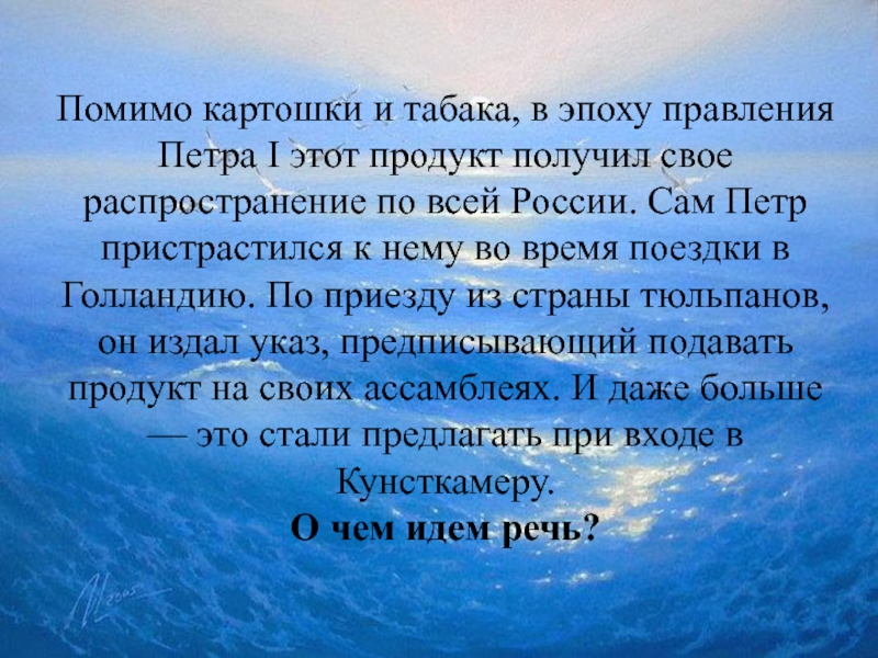 Слайд 52Помимо картошки и табака, в эпоху правления Петра I этот продукт