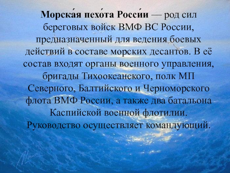 Слайд 2Морска́я пехо́та Росси́и — род сил береговых войск ВМФ ВС России, предназначенный