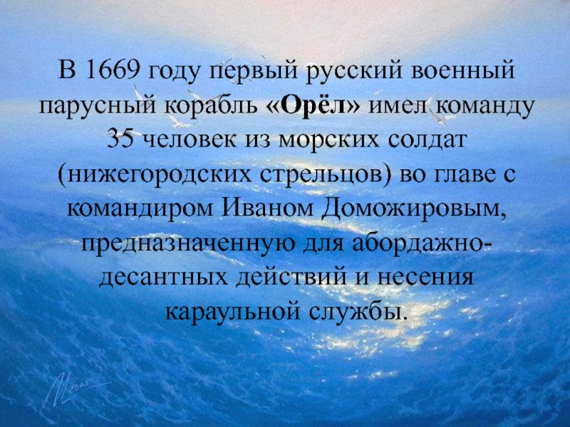 Слайд 6В 1669 году первый русский военный парусный корабль «Орёл» имел команду