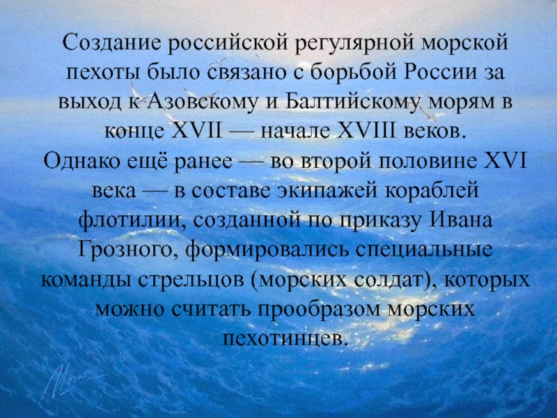 Однако ещё ранее — во второй половине XVI века — в составе экипажей кораблей флотилии, созданной по приказу Ивана Грозного, формировались специальные команды стрельцов (морских солдат), которых можно считать прообразом морских пехотинцев.