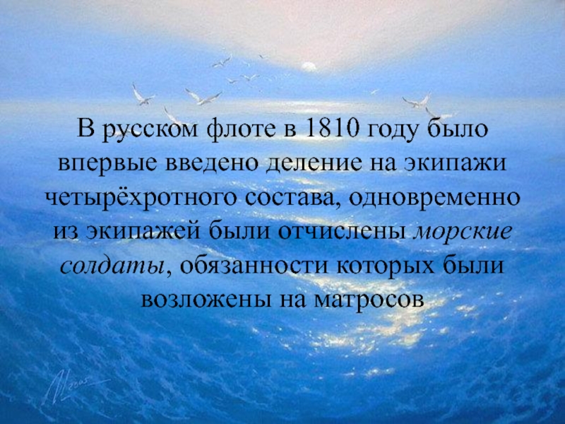 кровь офицеров Российской морской пехоты XVIII века. Рядовой состав русской морской пехоты отличался социальной, национальной и религиозной однородностью, что придавало ему характер единого организма, воспитывало чувство патриотизма и воинского долга по защите Отечества.