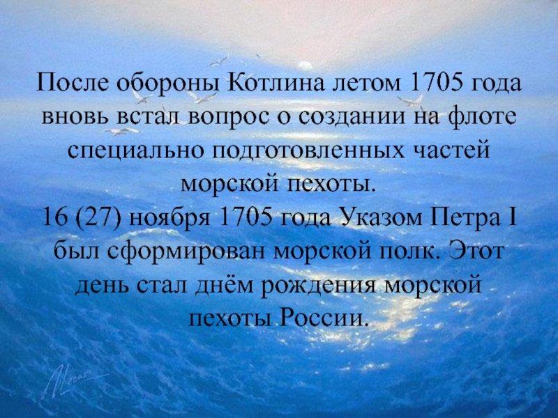 16 (27) ноября 1705 года Указом Петра I был сформирован морской полк. Этот день стал днём рождения морской пехоты России.