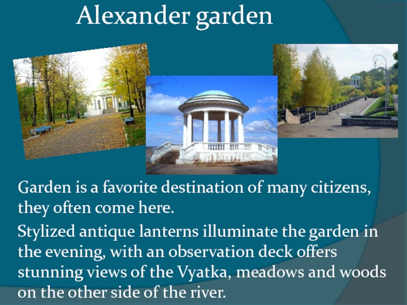 Alexander garden  Garden is a favorite destination of many citizens, they often come here.  Stylized