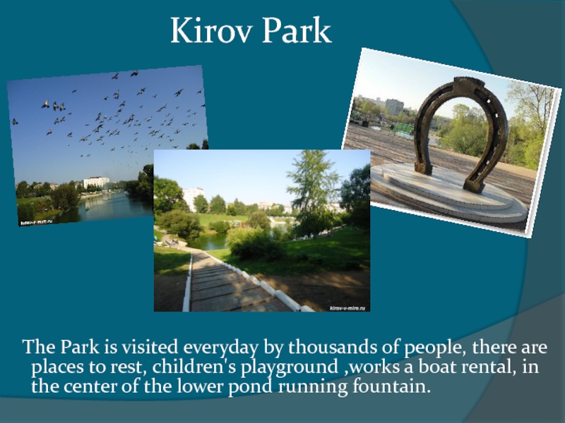 Kirov Park The Park is visited everyday by thousands of people, there are places to rest, children's playground ,works a boat rental, in the center of the lower pond running fountain.