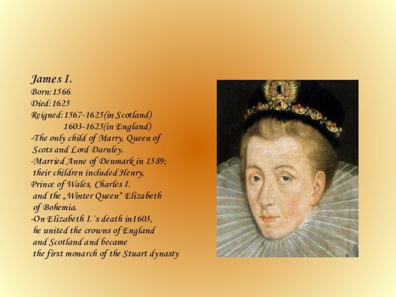 James I.Born:1566Died:1625Reigned:1567-1625(in Scotland)        1603-1625(in England)-The only child of Marry, Queen