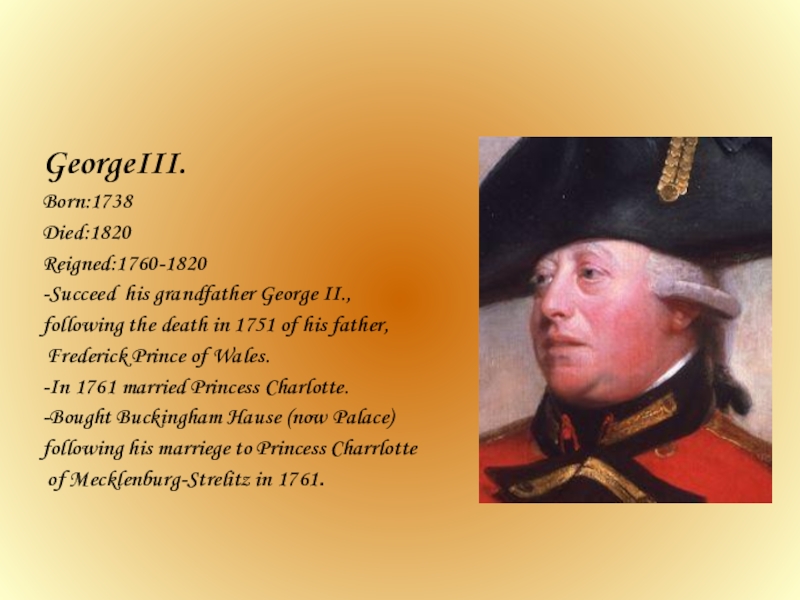 GeorgeIII.Born:1738Died:1820Reigned:1760-1820-Succeed his grandfather George II., following the death in 1751 of his father, Frederick Prince of Wales.-In