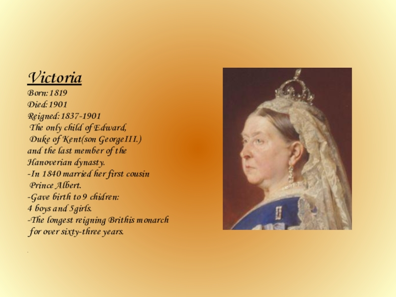 VictoriaBorn:1819Died:1901Reigned:1837-1901 The only child of Edward, Duke of Kent(son GeorgeIII.)and the last member of the Hanoverian dynasty.-In