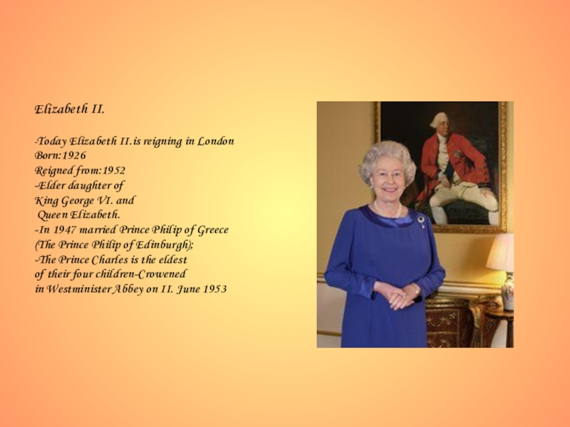 Elizabeth II.-Today Elizabeth II.is reigning in LondonBorn:1926Reigned from:1952-Elder daughter of King George VI. and Queen Elizabeth.-In 1947