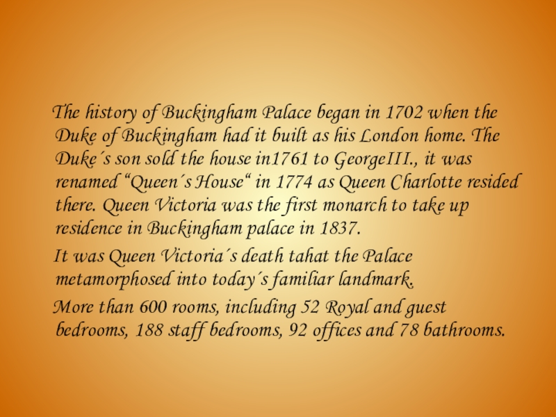 London. Today it is the Queen´s official residence with 755 rooms. It is one of the few working royal palaces remaining in the world today. During August and September when The Queen makes her annual visit to Scotland, the Palace´s nineteen states rooms are opened to visitors. Buckingham palace is not only home of the Queen Elizabeth II. But also the London residence of her son Charles with his wife and his sons Harry and William. The Queen has other homes, too, including Windsor castle(last set Queen) and Barmoral in Scotland.