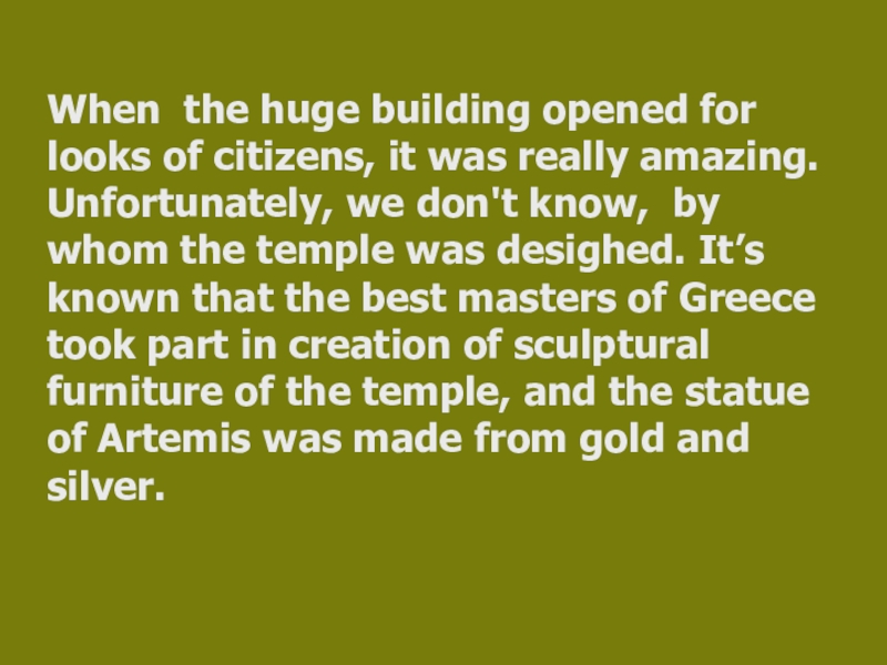 Unfortunately, we don't know, by whom the temple was desighed. It’s known that the best masters of Greece took part in creation of sculptural furniture of the temple, and the statue of Artemis was made from gold and silver.