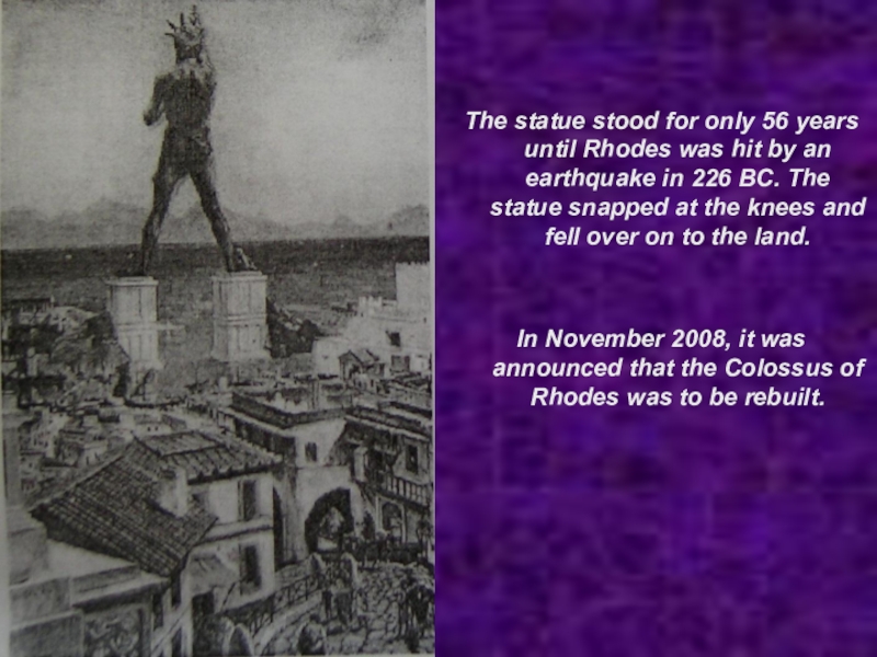 by an earthquake in 226 BC. The statue snapped at the knees and fell over on to the land.