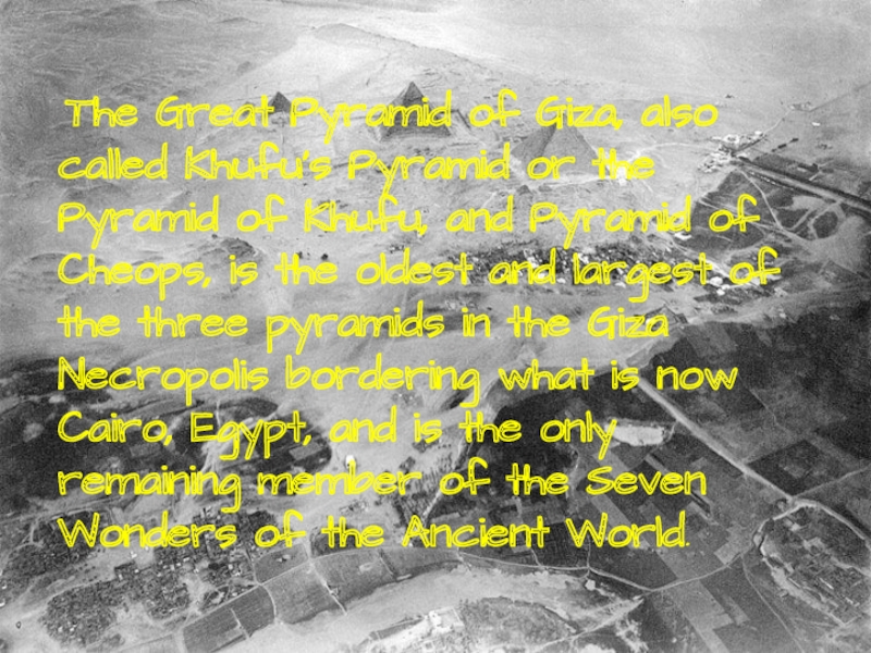 or the Pyramid of Khufu, and Pyramid of Cheops, is the oldest and largest of the three pyramids in the Giza Necropolis bordering what is now Cairo, Egypt, and is the only remaining member of the Seven Wonders of the Ancient World.