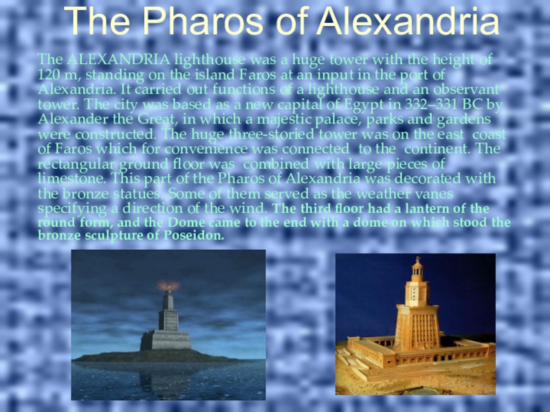 120 m, standing on the island Faros at an input in the port of Alexandria. It carried out functions of a lighthouse and an observant tower. The city was based as a new capital of Egypt in 332–331 BC by Alexander the Great, in which a majestic palace, parks and gardens were constructed. The huge three-storied tower was on the east coast of Faros which for convenience was connected to the continent. The rectangular ground floor was combined with large pieces of limestone. This part of the Pharos of Alexandria was decorated with the bronze statues. Some of them served as the weather vanes specifying a direction of the wind. The third floor had a lantern of the round form, and the Dome came to the end with a dome on which stood the bronze sculpture of Poseidon.