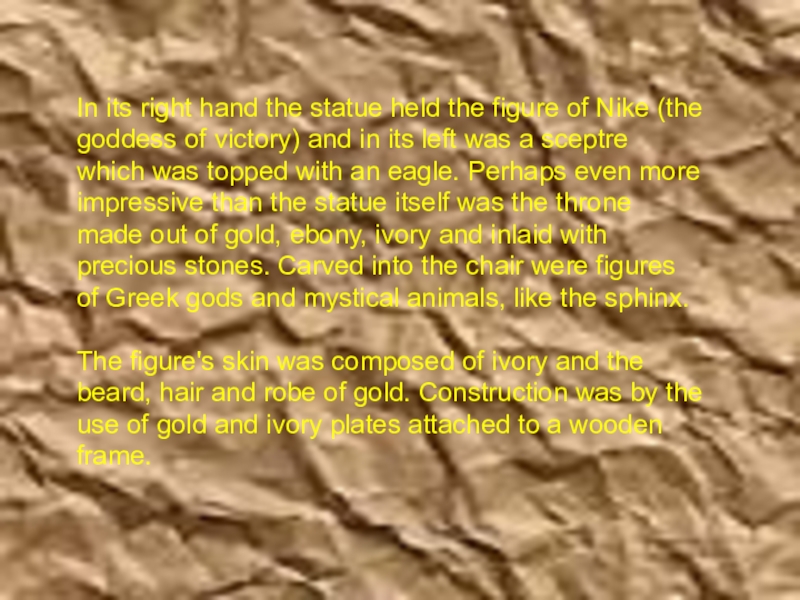 (the goddess of victory) and in its left was a sceptre which was topped with an eagle. Perhaps even more impressive than the statue itself was the throne made out of gold, ebony, ivory and inlaid with precious stones. Carved into the chair were figures of Greek gods and mystical animals, like the sphinx.