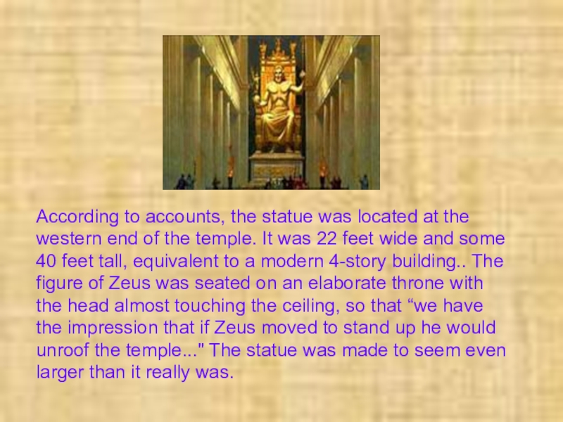 of the temple. It was 22 feet wide and some 40 feet tall, equivalent to a modern 4-story building.. The figure of Zeus was seated on an elaborate throne with the head almost touching the ceiling, so that “we have the impression that if Zeus moved to stand up he would unroof the temple..." The statue was made to seem even larger than it really was.