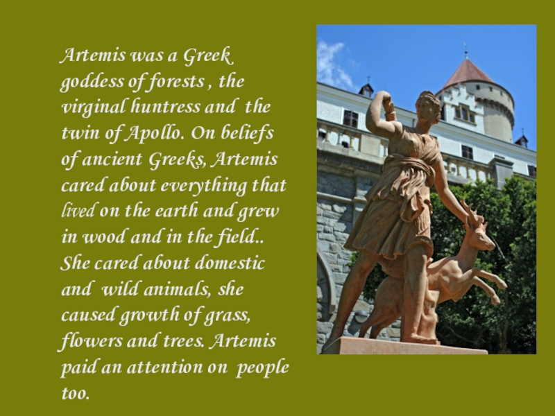 and the twin of Apollo. On beliefs of ancient Greeks, Artemis cared about everything that lived on the earth and grew in wood and in the field.. She cared about domestic and wild animals, she caused growth of grass, flowers and trees. Artemis paid an attention on people too.