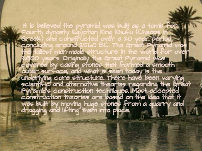 tomb for Fourth dynasty Egyptian King Khufu (Cheops in Greek) and constructed over a 20 year period concluding around 2560 BC. The Great Pyramid was the tallest man-made structure in the world for over 3,800 years. Originally the Great Pyramid was covered by casing stones that formed a smooth outer surface, and what is seen today is the underlying core structure. There have been varying scientific and alternative theories regarding the Great Pyramid's construction techniques. Most accepted construction theories are based on the idea that it was built by moving huge stones from a quarry and dragging and lifting them into place.