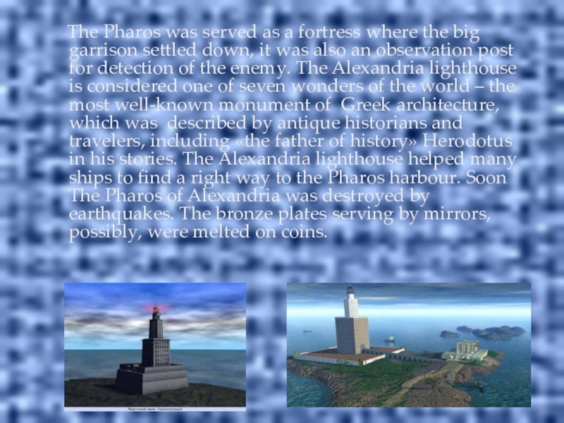 fortress where the big garrison settled down, it was also an observation post for detection of the enemy. The Alexandria lighthouse is considered one of seven wonders of the world – the most well-known monument of Greek architecture, which was described by antique historians and travelers, including «the father of history» Herodotus in his stories. The Alexandria lighthouse helped many ships to find a right way to the Pharos harbour. Soon The Pharos of Alexandria was destroyed by earthquakes. The bronze plates serving by mirrors, possibly, were melted on coins.