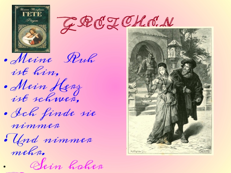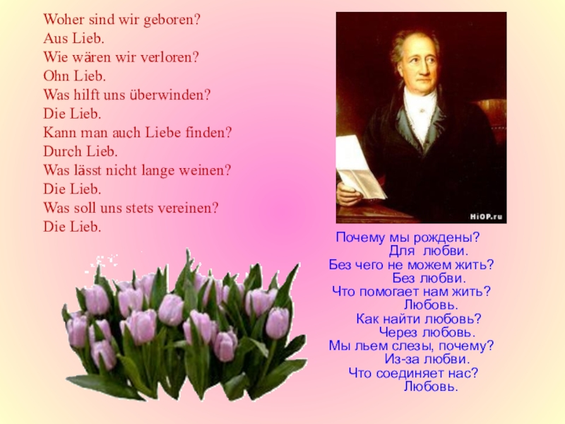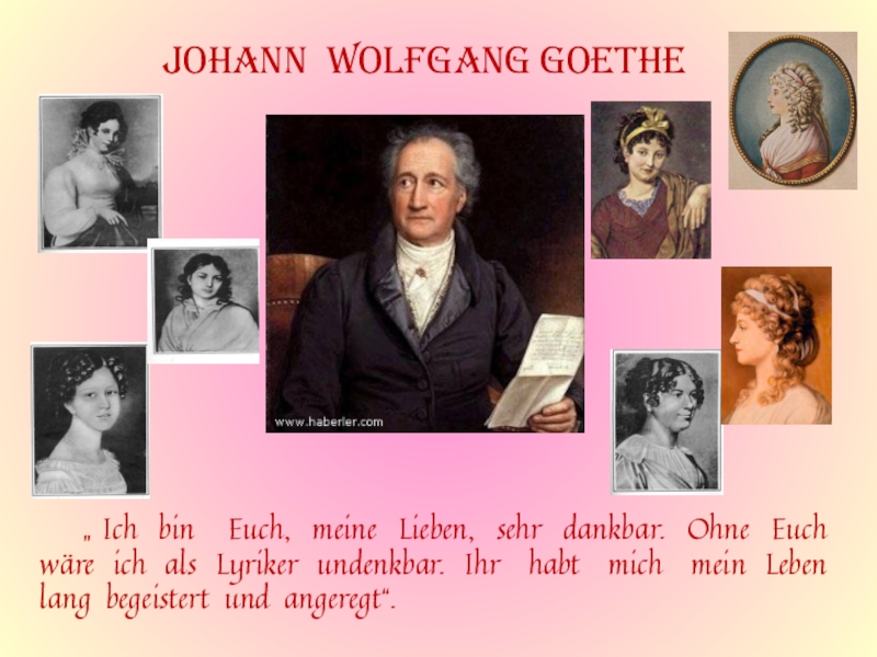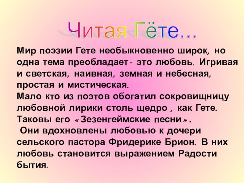 Слайд 6Мир поэзии Гете необыкновенно широк, но одна тема преобладает- это любовь.