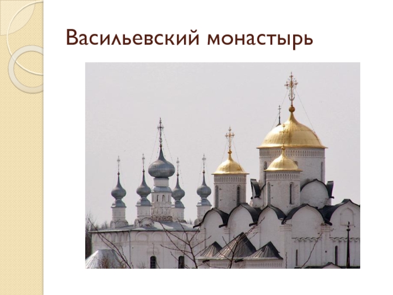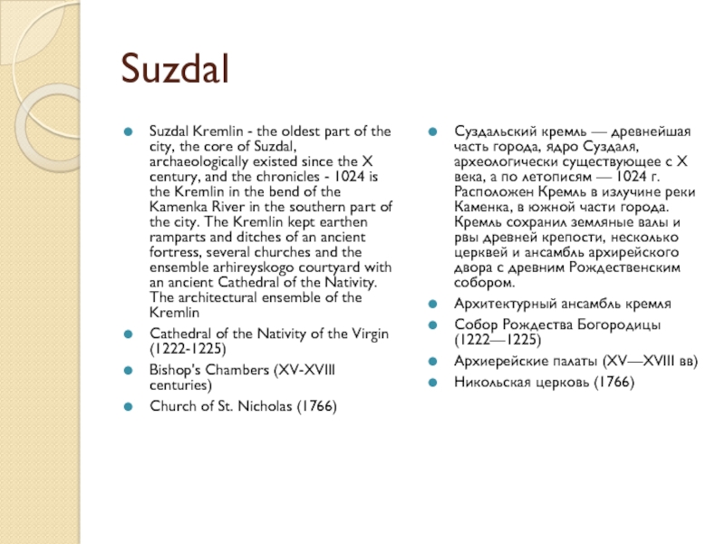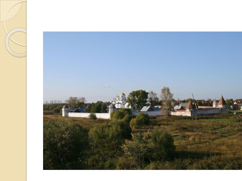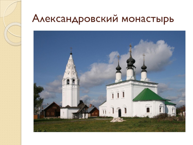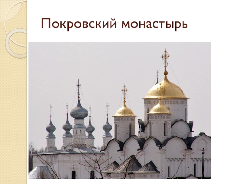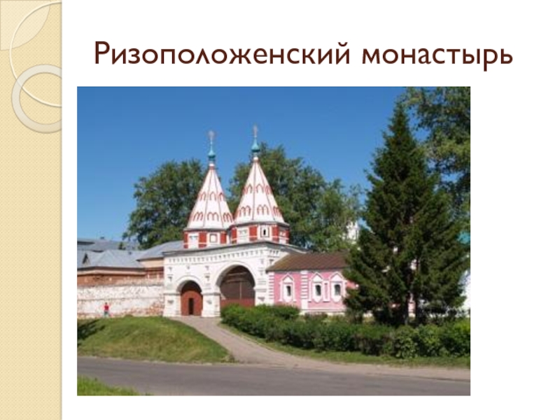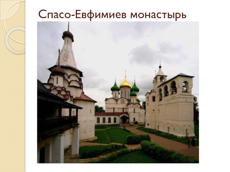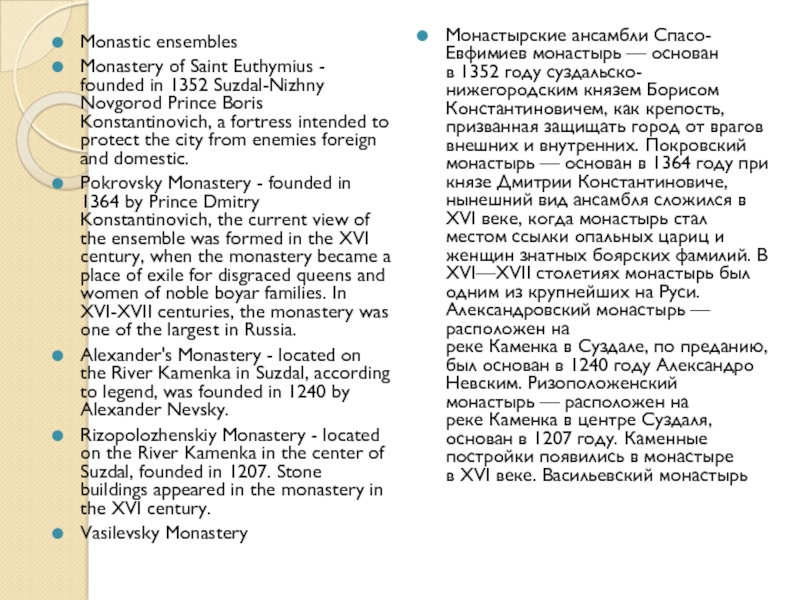 Монастырские ансамбли Спасо-Евфимиев монастырь — основан в 1352 году суздальско-нижегородским князем Борисом Константиновичем, как крепость, призванная защищать город от врагов внешних и внутренних. Покровский монастырь — основан в 1364 году при князе Дмитрии Константиновиче, нынешний вид ансамбля сложился в XVI веке, когда монастырь стал местом ссылки опальных цариц и женщин знатных боярских фамилий. В XVI—XVII столетиях монастырь был одним из крупнейших на Руси. Александровский монастырь — расположен на реке Каменка в Суздале, по преданию, был основан в 1240 году Александро Невским. Ризоположенский монастырь — расположен на реке Каменка в центре Суздаля, основан в 1207 году. Каменные постройки появились в монастыре в XVI веке. Васильевский монастырь