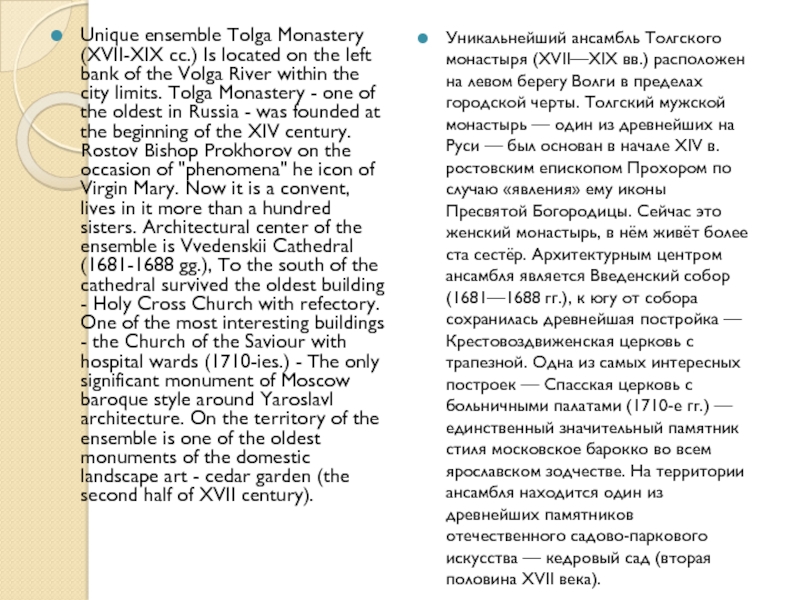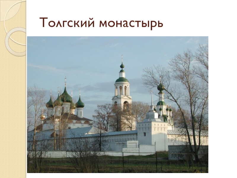 Уникальнейший ансамбль Толгского монастыря (XVII—XIX вв.) расположен на левом берегу Волги в пределах городской черты. Толгский мужской монастырь — один из древнейших на Руси — был основан в начале XIV в. ростовским епископом Прохором по случаю «явления» ему иконы Пресвятой Богородицы. Сейчас это женский монастырь, в нём живёт более ста сестёр. Архитектурным центром ансамбля является Введенский собор (1681—1688 гг.), к югу от собора сохранилась древнейшая постройка — Крестовоздвиженская церковь с трапезной. Одна из самых интересных построек — Спасская церковь с больничными палатами (1710-е гг.) — единственный значительный памятник стиля московское барокко во всем ярославском зодчестве. На территории ансамбля находится один из древнейших памятников отечественного садово-паркового искусства — кедровый сад (вторая половина XVII века).