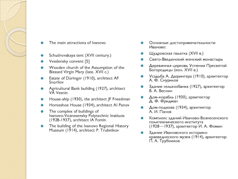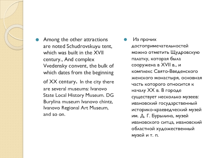 Из прочих достопримечательностей можно отметить Щудровскую палатку, которая была сооружена в XVII в., и комплекс Свято-Введенского женского монастыря, основная часть которого относится к началу XX в. В городе существует несколько музеев: ивановский государственный историко-краеведческий музей им. Д. Г. Бурылина, музей ивановского ситца, ивановский областной художественный музей и т. п.
