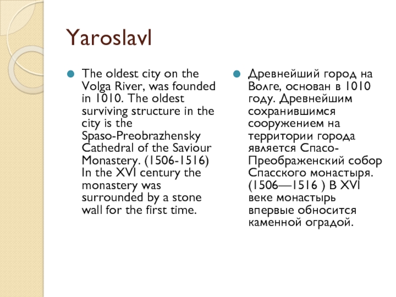 Древнейший город на Волге, основан в 1010 году. Древнейшим сохранившимся сооружением на территории города является Спасо-Преображенский собор Спасского монастыря. (1506—1516 ) В XVI веке монастырь впервые обносится каменной оградой.