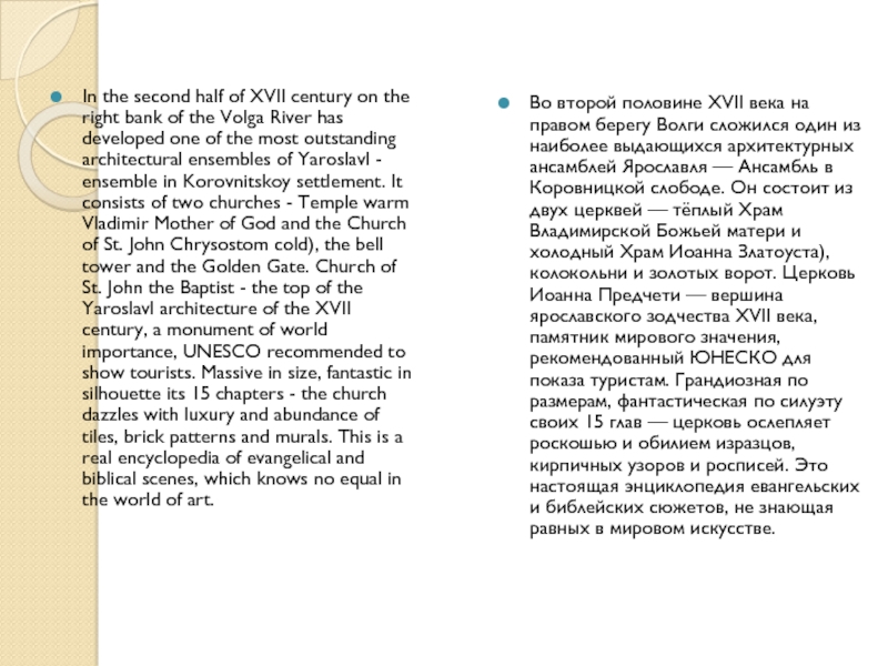 Во второй половине XVII века на правом берегу Волги сложился один из наиболее выдающихся архитектурных ансамблей Ярославля — Ансамбль в Коровницкой слободе. Он состоит из двух церквей — тёплый Храм Владимирской Божьей матери и холодный Храм Иоанна Златоуста), колокольни и золотых ворот. Церковь Иоанна Предчети — вершина ярославского зодчества XVII века, памятник мирового значения, рекомендованный ЮНЕСКО для показа туристам. Грандиозная по размерам, фантастическая по силуэту своих 15 глав — церковь ослепляет роскошью и обилием изразцов, кирпичных узоров и росписей. Это настоящая энциклопедия евангельских и библейских сюжетов, не знающая равных в мировом искусстве.
