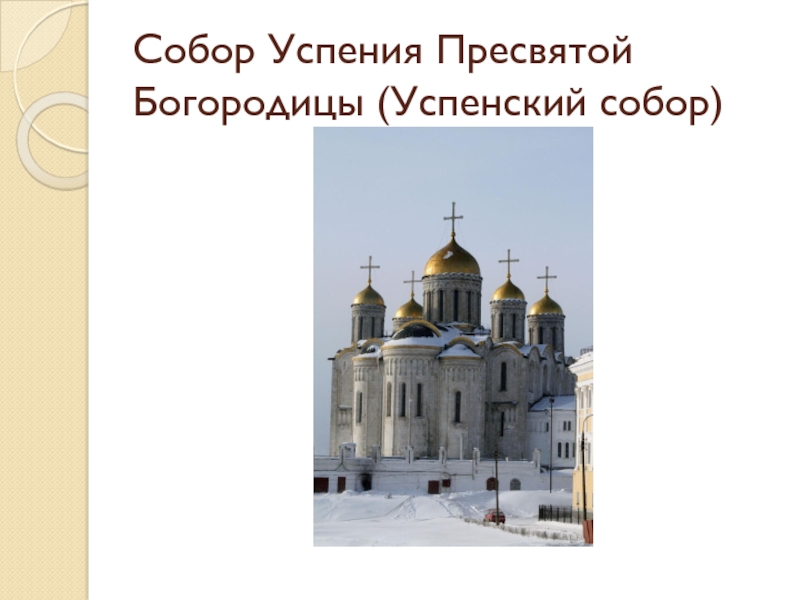 Успенский (1158—60, перестроен в 1185—1189; 6-столпный, 5-нефный, 3-апсидный храм с 5 главами; в интерьере — фрагменты фресок XII—XIII веков и фрески 1408 работы Рублёва и Даниила Чёрного; в 1810 к собору была пристроена колокольня, в 1862 — придел Георгия);
