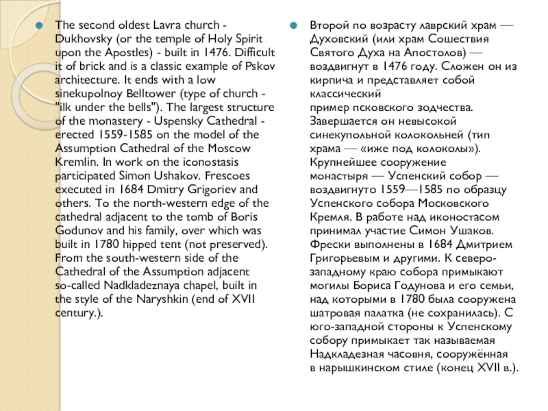 Второй по возрасту лаврский храм — Духовский (или храм Сошествия Святого Духа на Апостолов) — воздвигнут в 1476 году. Сложен он из кирпича и представляет собой классический пример псковского зодчества. Завершается он невысокой синекупольной колокольней (тип храма — «иже под колоколы»). Крупнейшее сооружение монастыря — Успенский собор — воздвигнуто 1559—1585 по образцу Успенского собора Московского Кремля. В работе над иконостасом принимал участие Симон Ушаков. Фрески выполнены в 1684 Дмитрием Григорьевым и другими. К северо-западному краю собора примыкают могилы Бориса Годунова и его семьи, над которыми в 1780 была сооружена шатровая палатка (не сохранилась). С юго-западной стороны к Успенскому собору примыкает так называемая Надкладезная часовня, сооружённая в нарышкинском стиле (конец XVII в.).