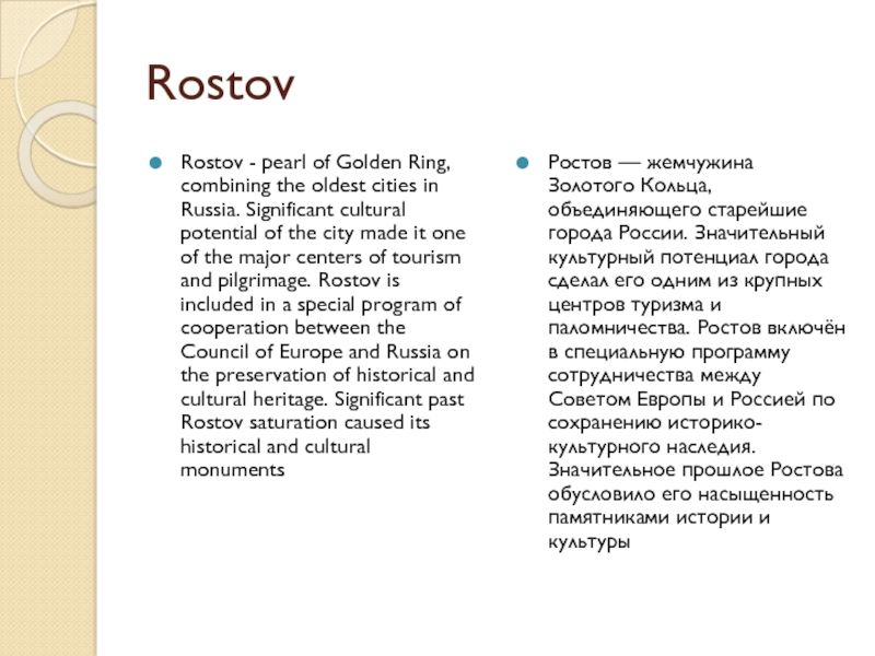 Ростов — жемчужина Золотого Кольца, объединяющего старейшие города России. Значительный культурный потенциал города сделал его одним из крупных центров туризма и паломничества. Ростов включён в специальную программу сотрудничества между Советом Европы и Россией по сохранению историко-культурного наследия. Значительное прошлое Ростова обусловило его насыщенность памятниками истории и культуры