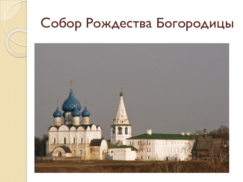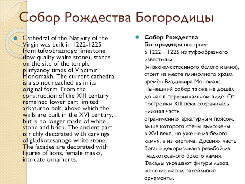 Собор Рождества Богородицы построен в 1222—1225 из туфообразного известняка (низкокачественного белого камня), стоит на месте плинфяного храма времён Владимира Мономаха. Нынешний собор также не дошёл до нас в первоначальном виде. От постройки XIII века сохранилась нижняя часть, ограниченная аркатурным поясом, выше которого стены выложены в XVI веке, но уже не из белого камня, а из кирпича. Древняя часть богато декорирована резьбой из гладкотесаного белого камня. Фасады украшают фигуры львов, женские маски, затейливые орнаменты.