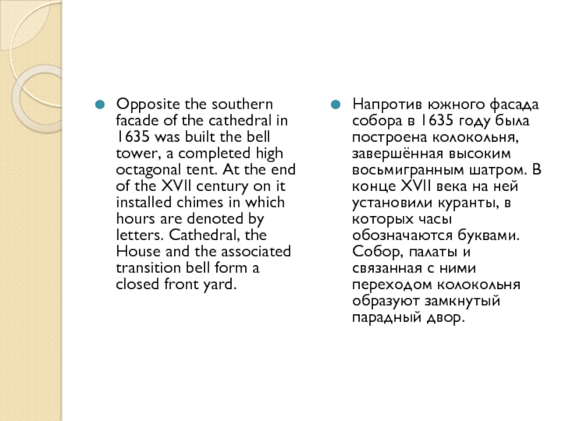 Напротив южного фасада собора в 1635 году была построена колокольня, завершённая высоким восьмигранным шатром. В конце XVII века на ней установили куранты, в которых часы обозначаются буквами. Собор, палаты и связанная с ними переходом колокольня образуют замкнутый парадный двор.