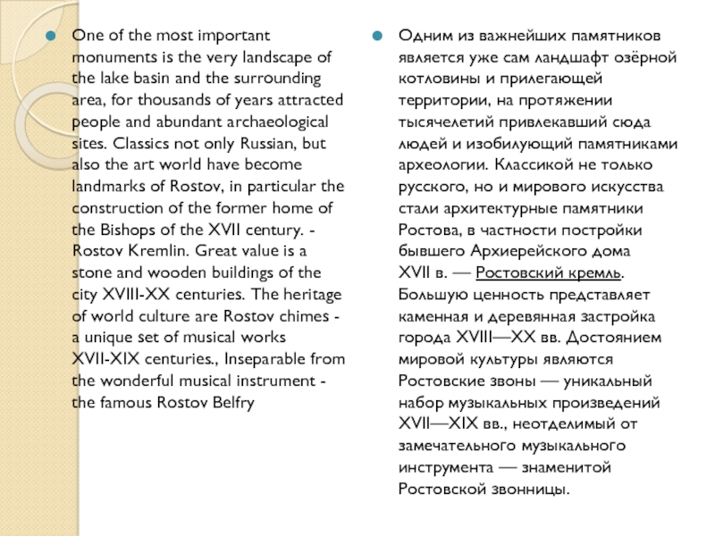 Одним из важнейших памятников является уже сам ландшафт озёрной котловины и прилегающей территории, на протяжении тысячелетий привлекавший сюда людей и изобилующий памятниками археологии. Классикой не только русского, но и мирового искусства стали архитектурные памятники Ростова, в частности постройки бывшего Архиерейского дома XVII в. — Ростовский кремль. Большую ценность представляет каменная и деревянная застройка города XVIII—XX вв. Достоянием мировой культуры являются Ростовские звоны — уникальный набор музыкальных произведений XVII—XIX вв., неотделимый от замечательного музыкального инструмента — знаменитой Ростовской звонницы.