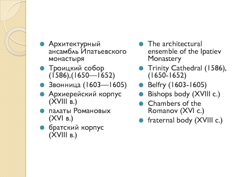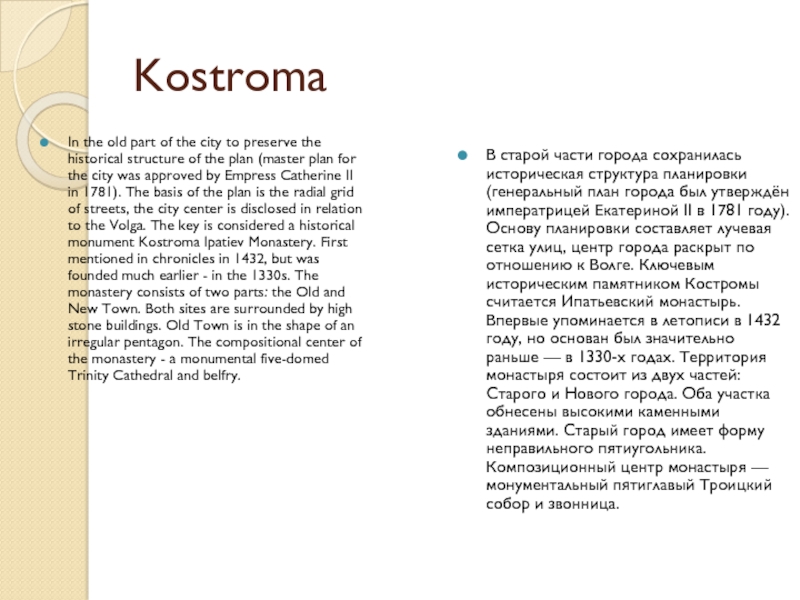 In the old part of the city to preserve the historical structure of the plan (master plan for the city was approved by Empress Catherine II in 1781). The basis of the plan is the radial grid of streets, the city center is disclosed in relation to the Volga. The key is considered a historical monument Kostroma Ipatiev Monastery. First mentioned in chronicles in 1432, but was founded much earlier - in the 1330s. The monastery consists of two parts: the Old and New Town. Both sites are surrounded by high stone buildings. Old Town is in the shape of an irregular pentagon. The compositional center of the monastery - a monumental five-domed Trinity Cathedral and belfry.