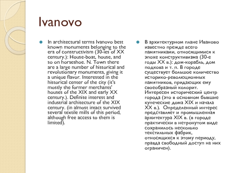 В архитектурном плане Иваново известно прежде всего памятниками, относящимися к эпохе конструктивизма (30-е годы XX в.): дом-корабль, дом подкова и т. п. В городе существует большое количество историко-революционных памятников, придающих ему своеобразный колорит. Интересен исторический центр города (это в основном бывшие купеческие дома XIX и начала XX в.). Определенный интерес представляет и промышленная архитектура XIX в. (в городе практически в нетронутом виде сохранилось несколько текстильных фабрик, относящихся к этому периоду, правда свободный доступ на них ограничен).