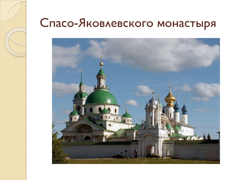 На западной окраине города, на берегу озера Неро, расположен красивейший ансамбль Спасо-Яковлевского монастыря. Панорама Спасо-Яковлевского монастыря с живописным сочетанием различных по стилю архитектурных форм — псевдоготические завершения башен, барочные и классические завершения церквей — производит впечатление сказочного чудо-города, прекрасно вписанного в приозёрный ландшафт.