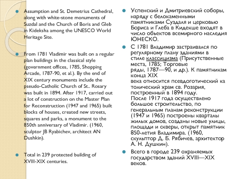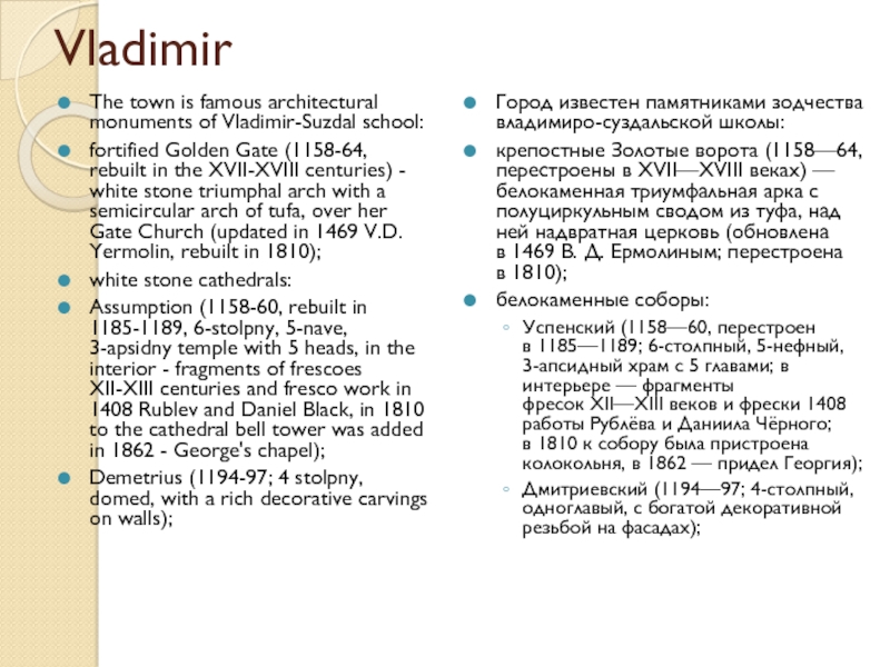 Город известен памятниками зодчества владимиро-суздальской школы:
