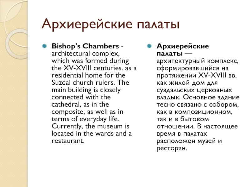 Архиерейские палаты — архитектурный комплекс, сформировавшийся на протяжении XV-XVIII вв. как жилой дом для суздальских церковных владык. Основное здание тесно связано с собором, как в композиционном, так и в бытовом отношении. В настоящее время в палатах расположен музей и ресторан.