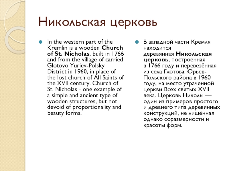 В западной части Кремля находится деревянная Никольская церковь, построенная в 1766 году и перевезённая из села Глотова Юрьев-Польского района в 1960 году, на место утраченной церкви Всех святых XVII века. Церковь Николы — один из примеров простого и древнего типа деревянных конструкций, не лишённая однако соразмерности и красоты форм.