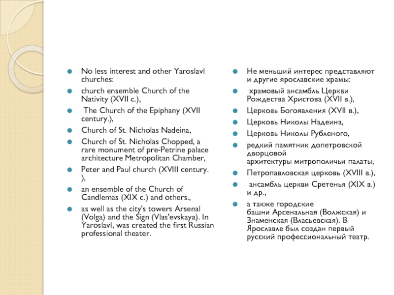 а также городские башни Арсенальная (Волжская) и Знаменская (Власьевская). В Ярославле был создан первый русский профессиональный театр.