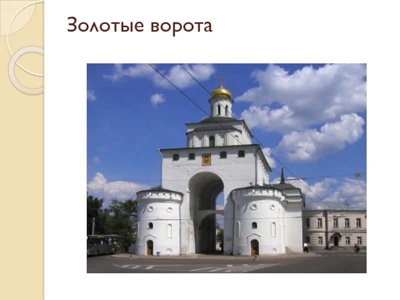 крепостные Золотые ворота (1158—64, перестроены в XVII—XVIII веках) — белокаменная триумфальная арка с полуциркульным сводом из туфа, над ней надвратная церковь (обновлена в 1469 В. Д. Ермолиным; перестроена в 1810);