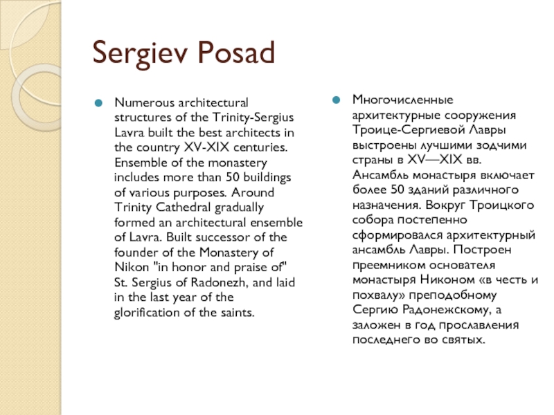 Многочисленные архитектурные сооружения Троице-Сергиевой Лавры выстроены лучшими зодчими страны в XV—XIX вв. Ансамбль монастыря включает более 50 зданий различного назначения. Вокруг Троицкого собора постепенно сформировался архитектурный ансамбль Лавры. Построен преемником основателя монастыря Никоном «в честь и похвалу» преподобному Сергию Радонежскому, а заложен в год прославления последнего во святых.