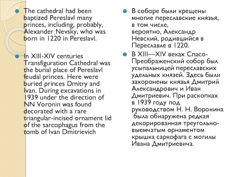 В XIII—XIV веках Спасо-Преображенский собор был усыпальницей переславских удельных князей. Здесь были захоронены князья Дмитрий Александрович и Иван Дмитриевич. При раскопках в 1939 году под руководством Н. Н. Воронина была обнаружена редкая декорированная треугольно-выемчатым орнаментом крышка саркофага с могилы Ивана Дмитриевича.