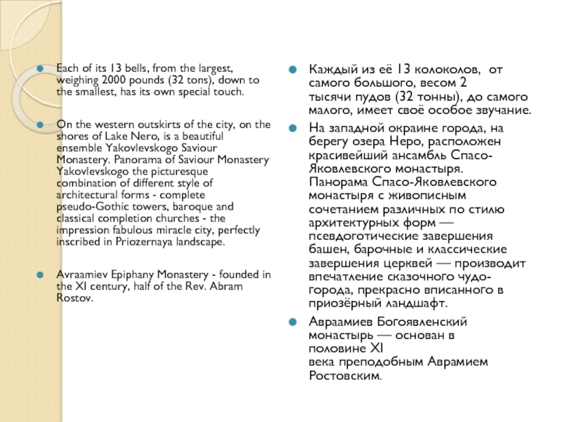 Каждый из её 13 колоколов, от самого большого, весом 2 тысячи пудов (32 тонны), до самого малого, имеет своё особое звучание.