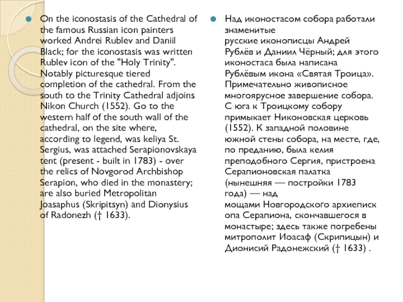 Над иконостасом собора работали знаменитые русские иконописцы Андрей Рублёв и Даниил Чёрный; для этого иконостаса была написана Рублёвым икона «Святая Троица». Примечательно живописное многоярусное завершение собора. С юга к Троицкому собору примыкает Никоновская церковь (1552). К западной половине южной стены собора, на месте, где, по преданию, была келия преподобного Сергия, пристроена Серапионовская палатка (нынешняя — постройки 1783 года) — над мощами Новгородского архиепископа Серапиона, скончавшегося в монастыре; здесь также погребены митрополит Иоасаф (Скрипицын) и Дионисий Радонежский († 1633) .