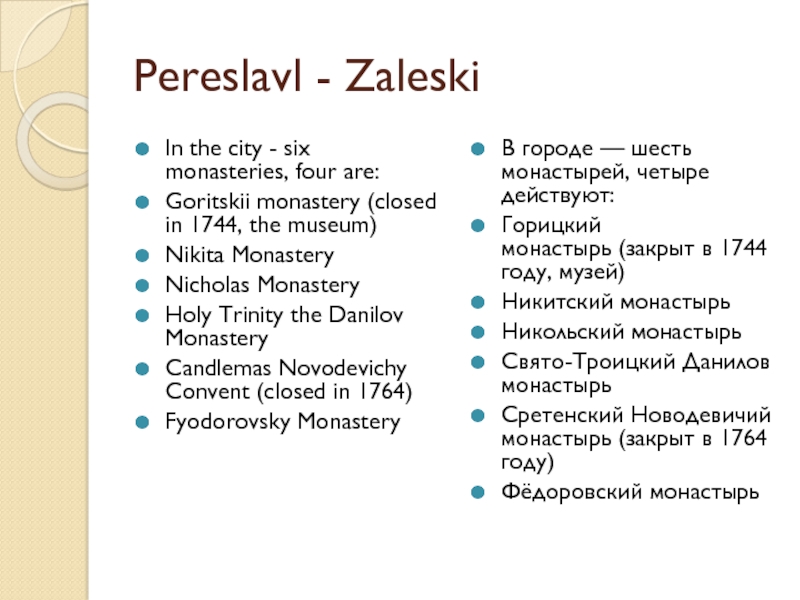 В XVIII—XIX веках был центром Переславской епархии. Позднее в городе работало Переславское духовное училище. В городе девять церквей, из которых замечательны: