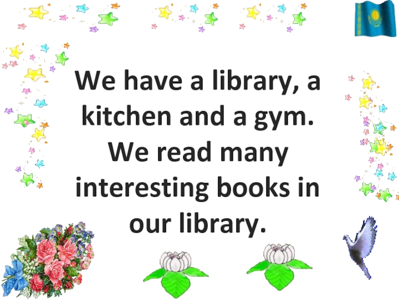 Слайд 7We have a library, a kitchen and a gym. We read